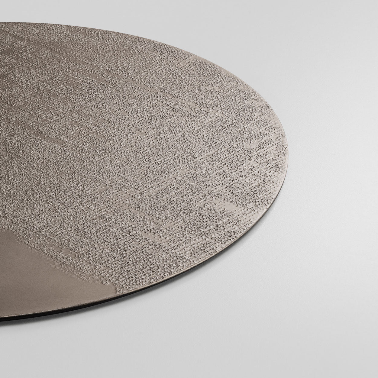 Tra ordito e trama si intreccia una tensione armoniosa, dove la materia rivela la sua struttura più profonda. Realizzato a mano su un supporto in fibra di legno, questo sottopiatto tondo è il risultato di una lavorazione che unisce vernice e tessuto, dando origine a superfici dense di ritmo e significato. Le texture stratificate riflettono un dialogo continuo tra pieni e vuoti, ordine e libertà, trasformando la superficie in un paesaggio visivo e tattile. Armature esprime un’eleganza silenziosa, fatta di equilibrio, ricerca e autenticità.