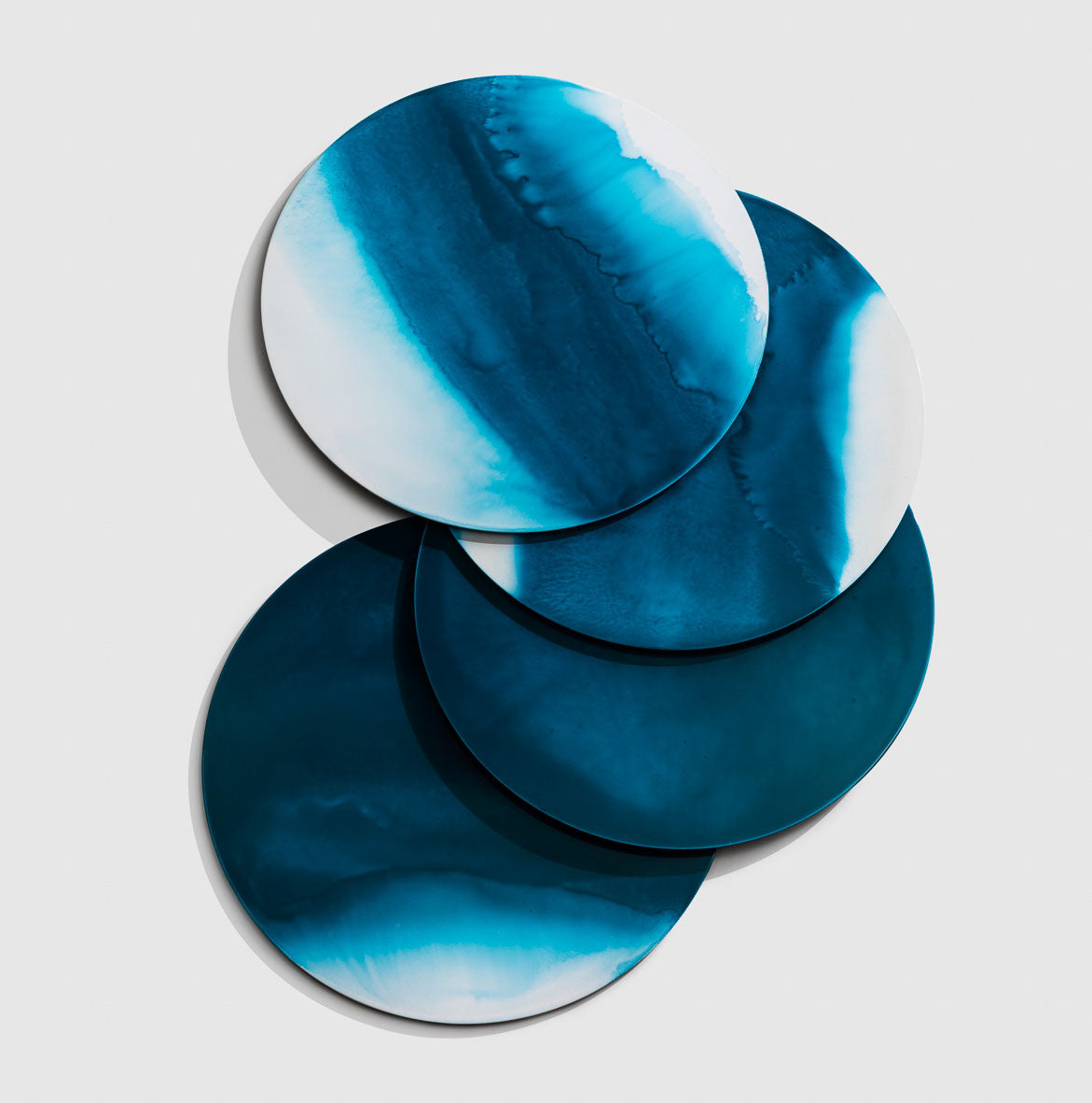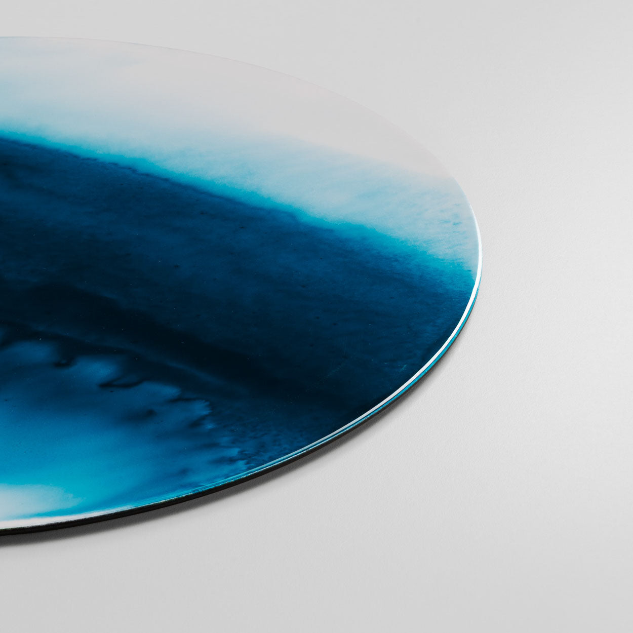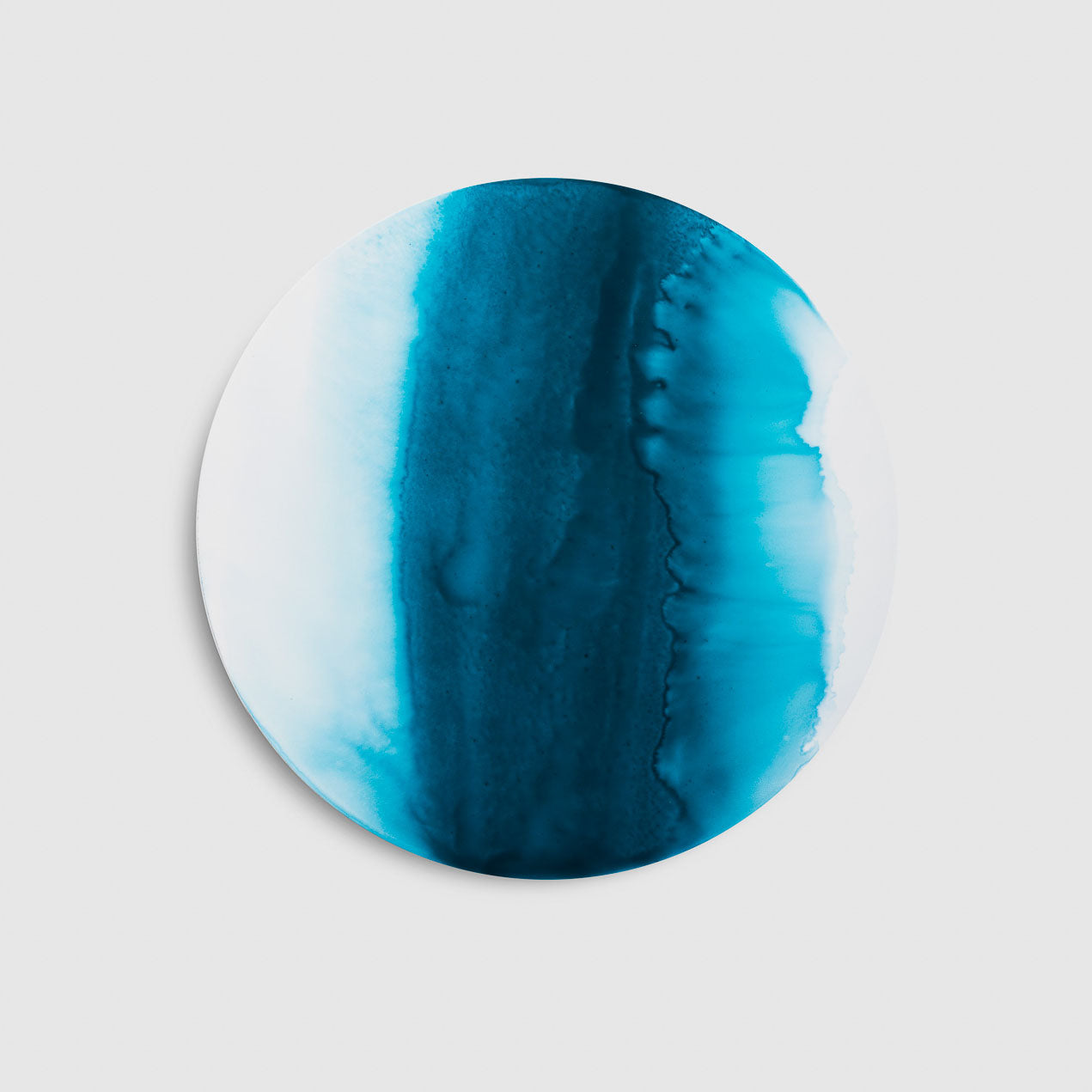 Dalla fluidità del colore prende vita una superficie morbida e vibrante, attraversata da velature leggere che si fondono in sfumature imprevedibili. Realizzato a mano su un supporto in fibra di legno, il sottopiatto tondo nasce da una stesura pittorica libera, in cui i pigmenti scorrono e si sovrappongono fino a creare profondità sottili e trasparenze poetiche. Ogni pezzo è un equilibrio delicato tra gesto e materia, tra presenza e dissolvenza, capace di restituire alla tavola un senso di quiete e di movimento silenzioso. Inchiostro è un invito a lasciarsi guidare dal fluire naturale del colore.