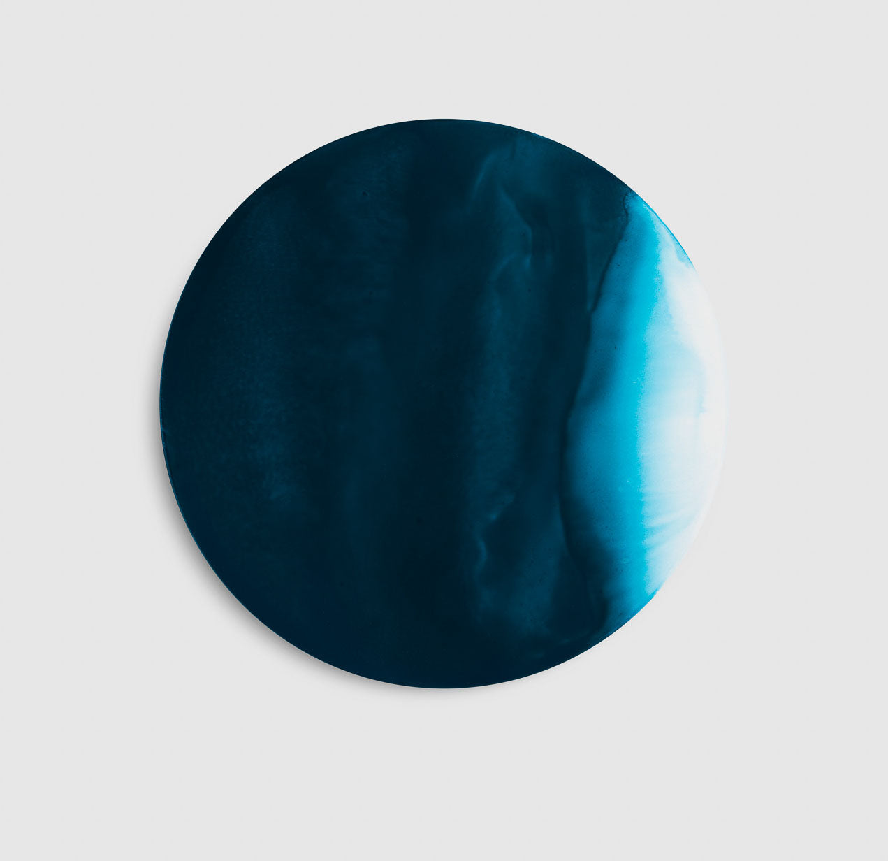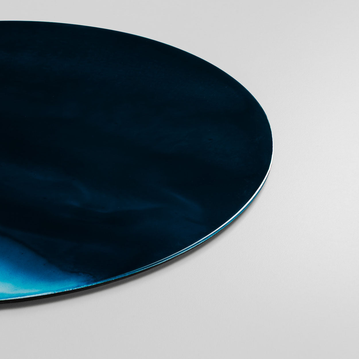 Dalla fluidità del colore prende vita una superficie morbida e vibrante, attraversata da velature leggere che si fondono in sfumature imprevedibili. Realizzato a mano su un supporto in fibra di legno, il sottopiatto tondo nasce da una stesura pittorica libera, in cui i pigmenti scorrono e si sovrappongono fino a creare profondità sottili e trasparenze poetiche. Ogni pezzo è un equilibrio delicato tra gesto e materia, tra presenza e dissolvenza, capace di restituire alla tavola un senso di quiete e di movimento silenzioso. Inchiostro è un invito a lasciarsi guidare dal fluire naturale del colore.