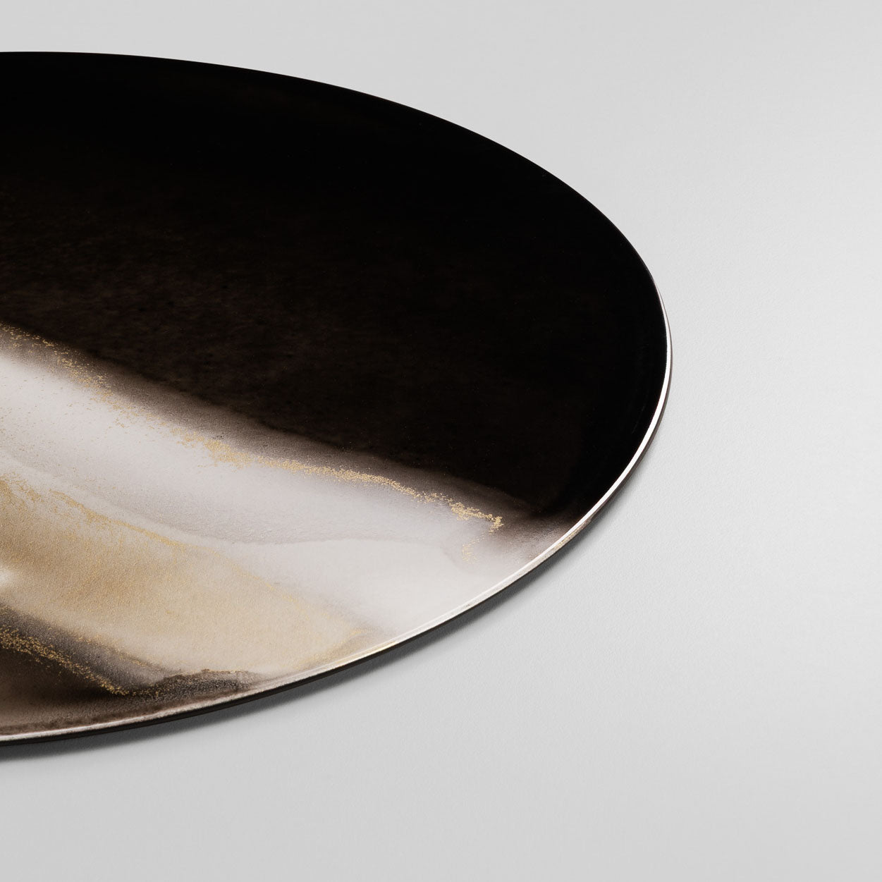Dalla fluidità del colore prende vita una superficie morbida e vibrante, attraversata da velature leggere che si fondono in sfumature imprevedibili. Realizzato a mano su un supporto in fibra di legno, il sottopiatto tondo nasce da una stesura pittorica libera, in cui i pigmenti scorrono e si sovrappongono fino a creare profondità sottili e trasparenze poetiche. Ogni pezzo è un equilibrio delicato tra gesto e materia, tra presenza e dissolvenza, capace di restituire alla tavola un senso di quiete e di movimento silenzioso. Inchiostro è un invito a lasciarsi guidare dal fluire naturale del colore.