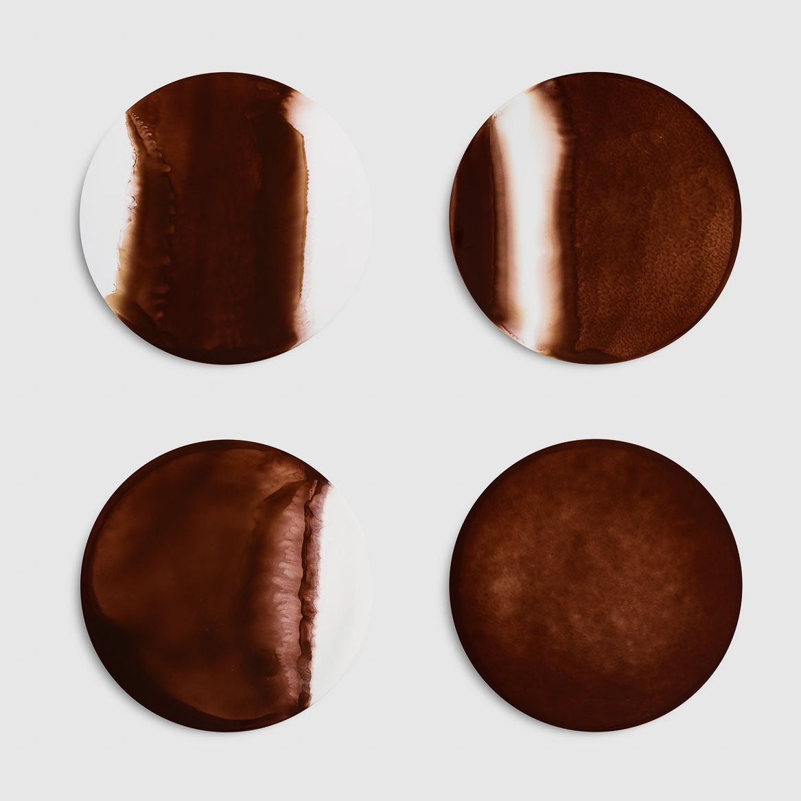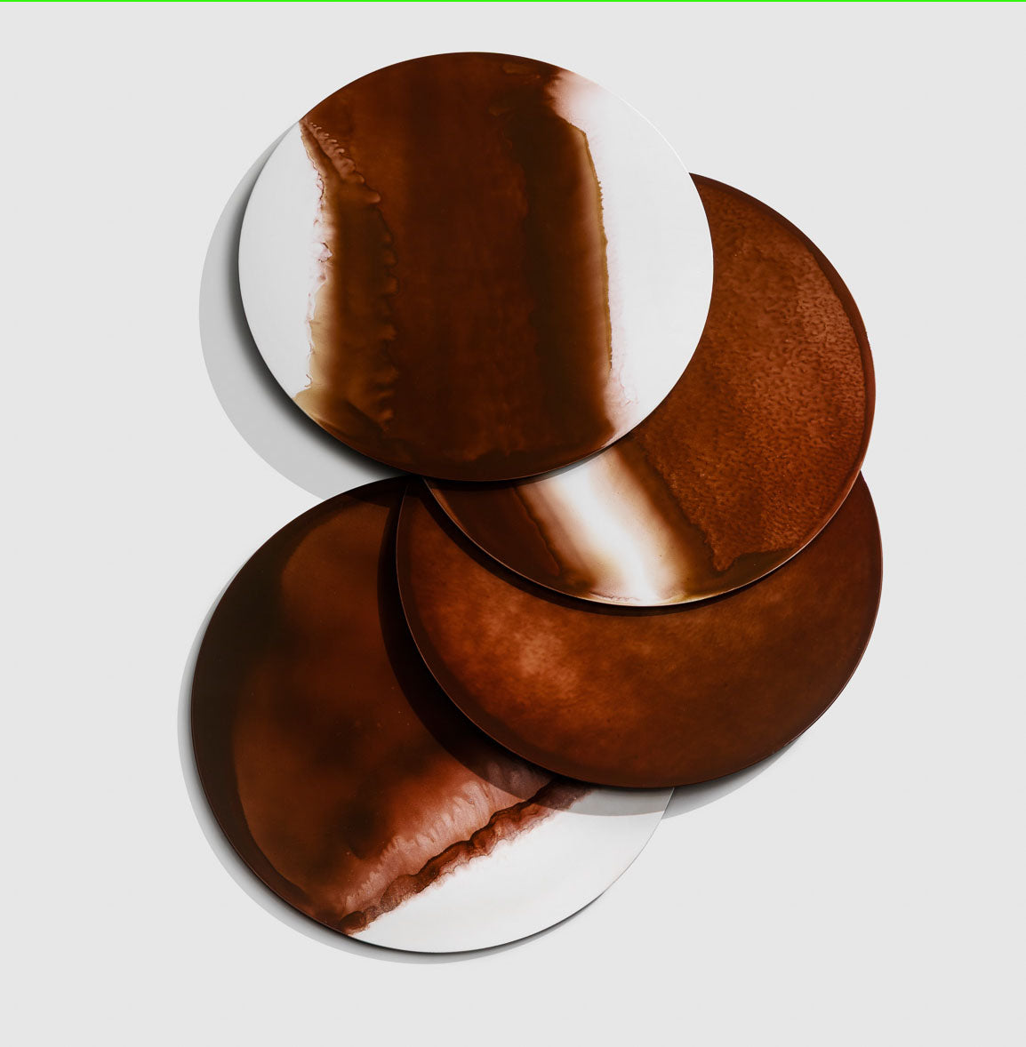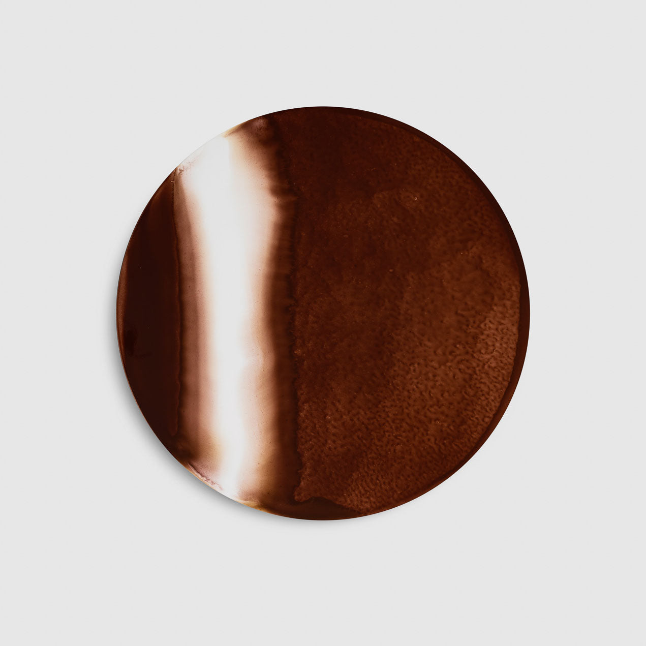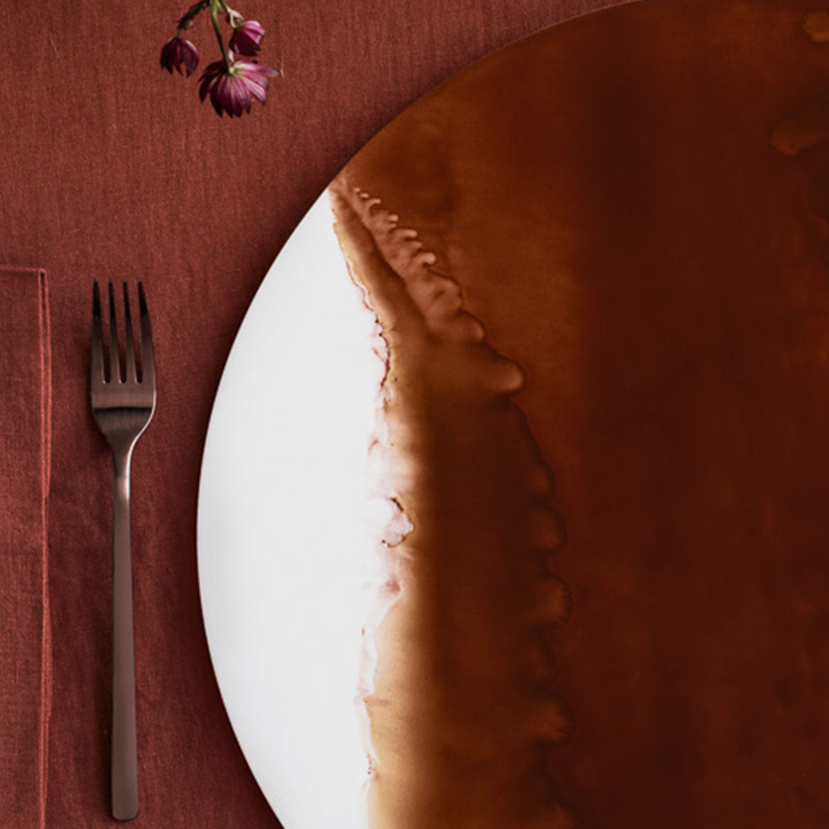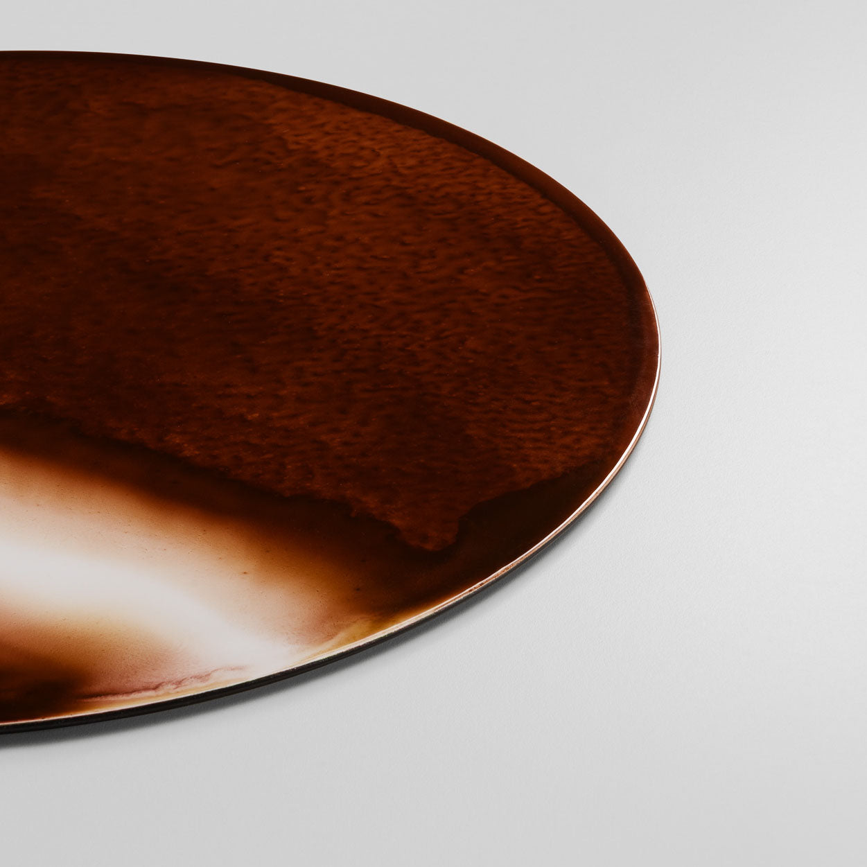 Dalla fluidità del colore prende vita una superficie morbida e vibrante, attraversata da velature leggere che si fondono in sfumature imprevedibili. Realizzato a mano su un supporto in fibra di legno, il sottopiatto tondo nasce da una stesura pittorica libera, in cui i pigmenti scorrono e si sovrappongono fino a creare profondità sottili e trasparenze poetiche. Ogni pezzo è un equilibrio delicato tra gesto e materia, tra presenza e dissolvenza, capace di restituire alla tavola un senso di quiete e di movimento silenzioso. Inchiostro è un invito a lasciarsi guidare dal fluire naturale del colore.