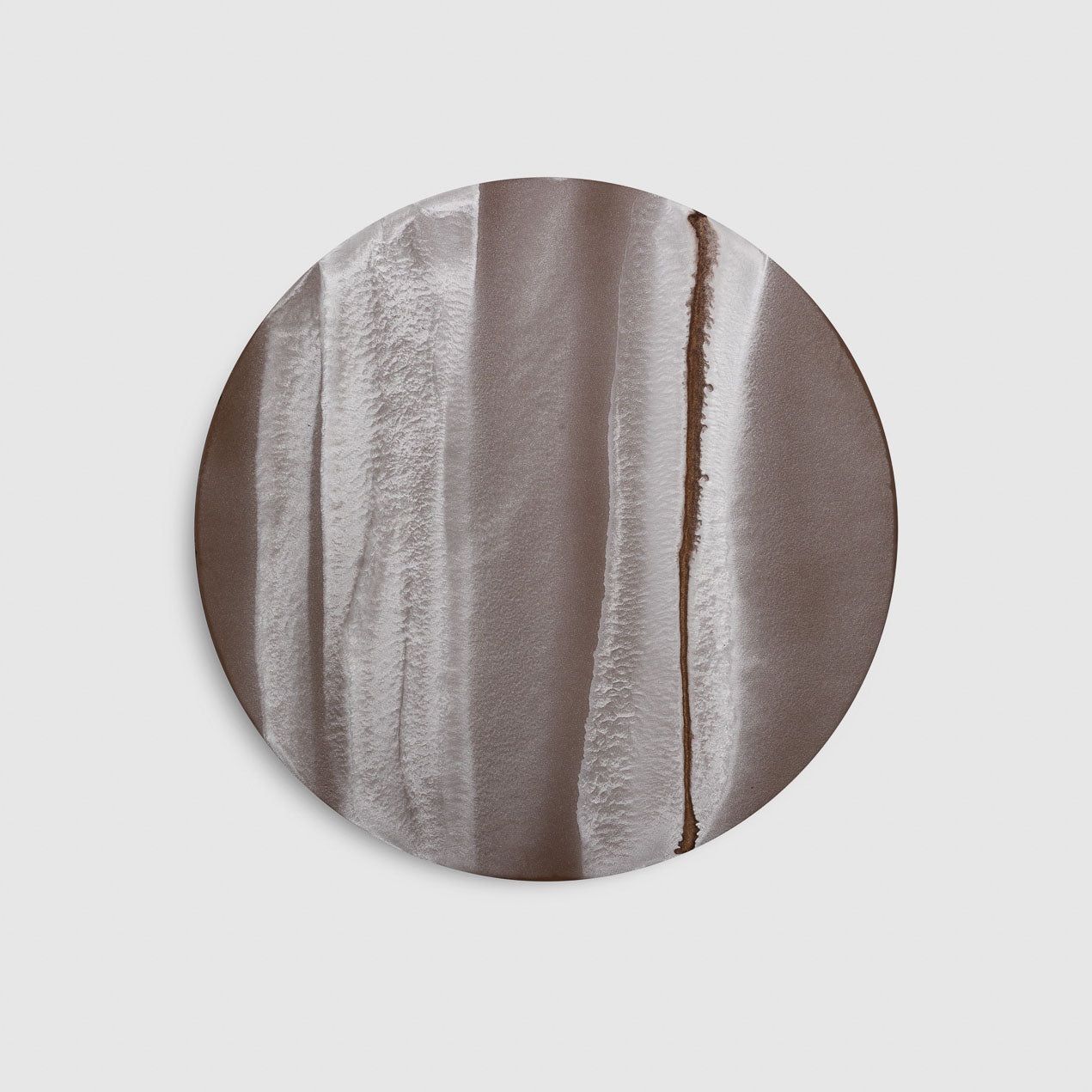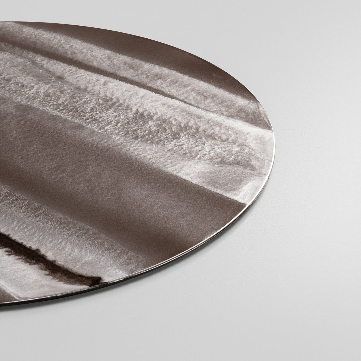 Sfumature di luce liquida si intrecciano alla materia, dando vita a una superficie cangiante che dialoga con l’ambiente. Realizzato a mano su un supporto in fibra di legno, il sottopiatto prende forma attraverso una lavorazione pittorica che riproduce con delicatezza l’effetto madreperla, restituendo riflessi morbidi e vibrazioni sottili a ogni variazione di luce. La forma tonda esalta l’armonia del disegno e ne amplifica la profondità visiva. Ogni pezzo è unico: un frammento di luce che racconta l’eleganza autentica e senza tempo di Maar.