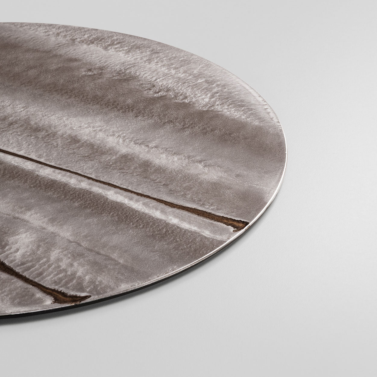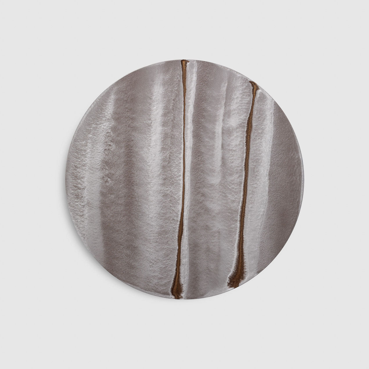 Sfumature di luce liquida si intrecciano alla materia, dando vita a una superficie cangiante che dialoga con l’ambiente. Realizzato a mano su un supporto in fibra di legno, il sottopiatto prende forma attraverso una lavorazione pittorica che riproduce con delicatezza l’effetto madreperla, restituendo riflessi morbidi e vibrazioni sottili a ogni variazione di luce. La forma tonda esalta l’armonia del disegno e ne amplifica la profondità visiva. Ogni pezzo è unico: un frammento di luce che racconta l’eleganza autentica e senza tempo di Maar.