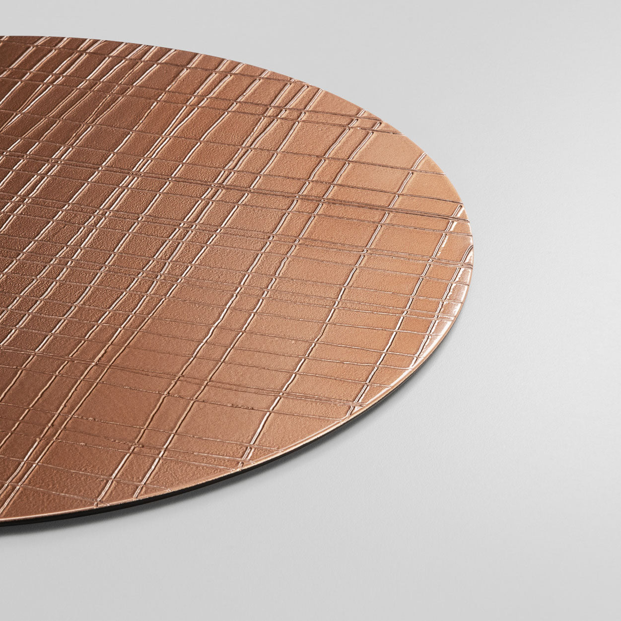 Sulla superficie si imprimono segni sottili, tracce di un gesto che incontra la materia e ne custodisce la memoria. Realizzato a mano su un supporto in fibra di legno, questo sottopiatto tondo nasce da un processo artigianale che valorizza ogni imperfezione, trasformandola in parte del suo linguaggio visivo. Le leggere variazioni di texture raccontano il passaggio dello strumento sulla superficie, creando un ritmo di pieni e vuoti che rende ogni pezzo irripetibile. Come una scrittura silenziosa, Tracce narra la bellezza del gesto e la poesia dell’impermanenza.